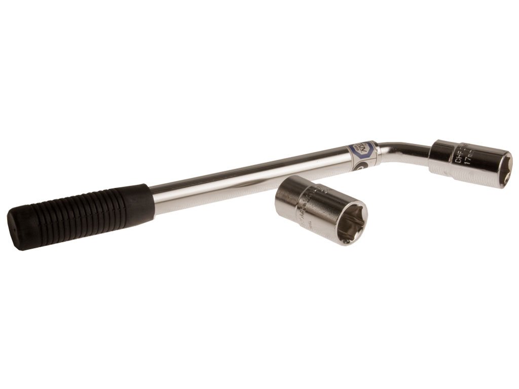 Klíč na kola teleskopický ocelový. Gumová rukojeť. Otočný ořech 17 a 19 + 21/23 mm. Délka po vytažení 550 mm.