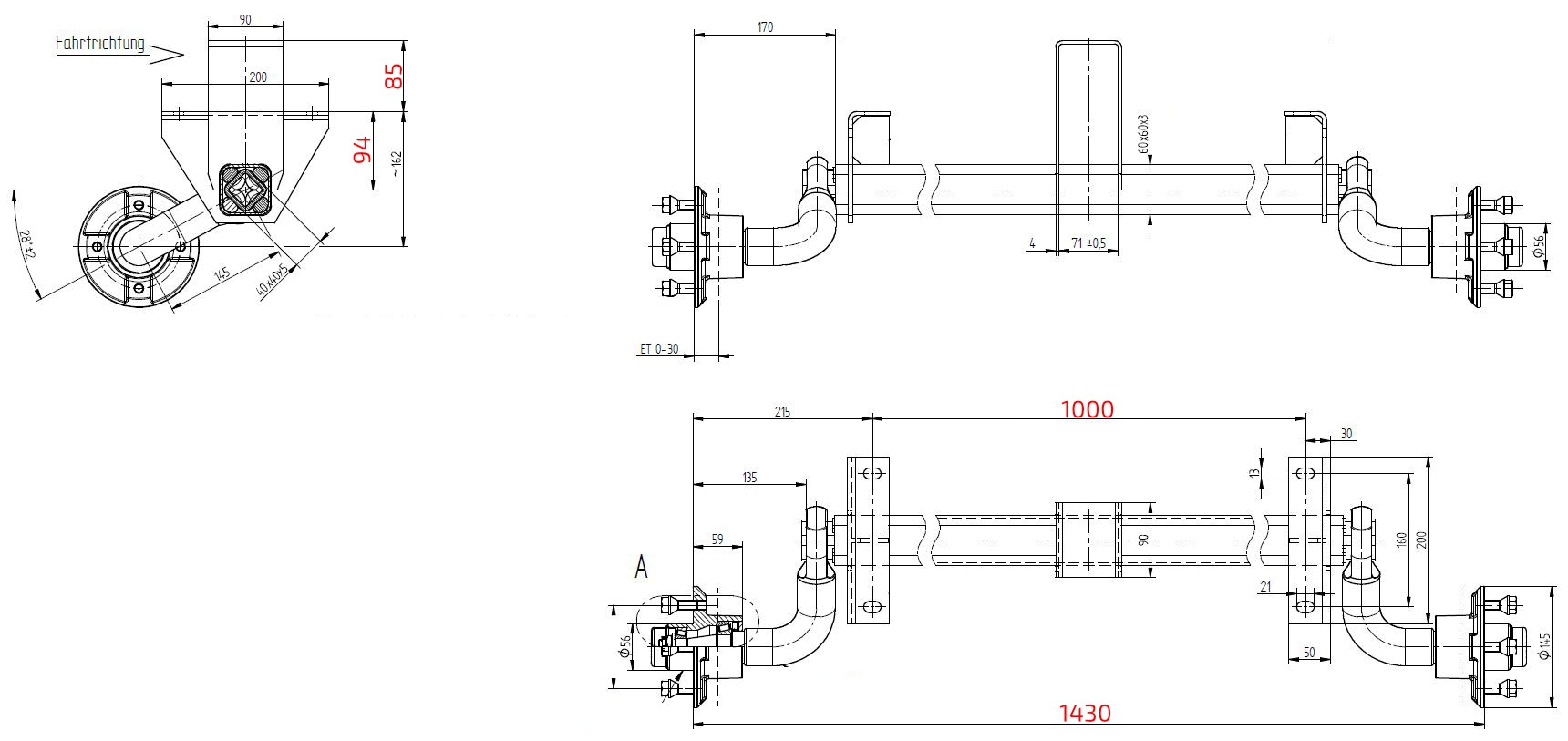 - Náprava KNOTT VG 7-L (750 kg) b=1000 mm, c=1430 mm (100x4), vysoké patky, stř. opěra