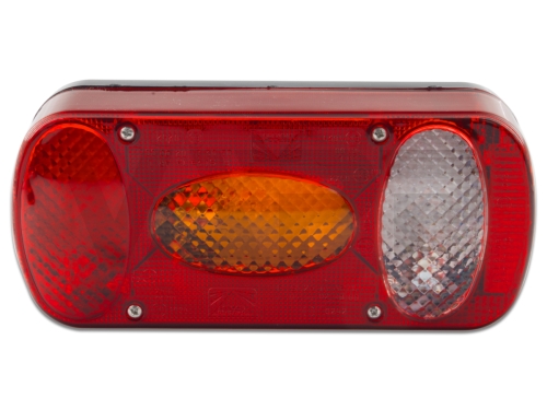 Kvalitní svítilna Aspöck v klasickém designu. Svítilna je homologovaná pro montáž na levou i pravou stranu. Tato varianta je opatřena připojením na pětipinový bajonet a z výroby je osazena 12V žárovkami. Součástí krytu svítilny je integrovaná odrazka netrojúhelníkového tvaru. Legislativa vyžaduje na přívěsu dvě červené odrazky trojúhelníkového tvaru, ty je v takovém případě potřeba zakoupit samostatně.