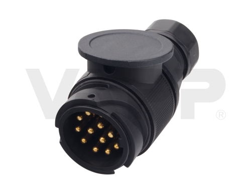Zástrčka 13-pólová dle ISO 11446. V kompaktním zkráceném provedení. Dodáváno s jednou gumovou průchodkou. Lze použít na elektroinstalace většiny přívěsů. Jednotlivé vodiče se k pinům připojují pomocí šroubků.